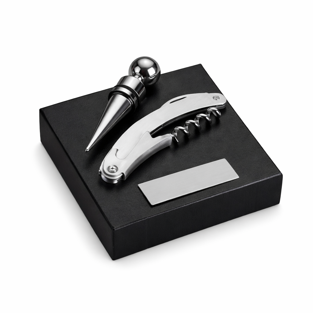 O kit é composto por um saca-rolhas metálico multifuncional, que inclui lâmina de corte e abridor de garrafa, além de uma tampa com bico para vedação e melhor conservação da bebida após a abertura. A parte interna do estojo possui berço em espuma, garantindo acomodação segura das peças e evitando movimentação durante o transporte.